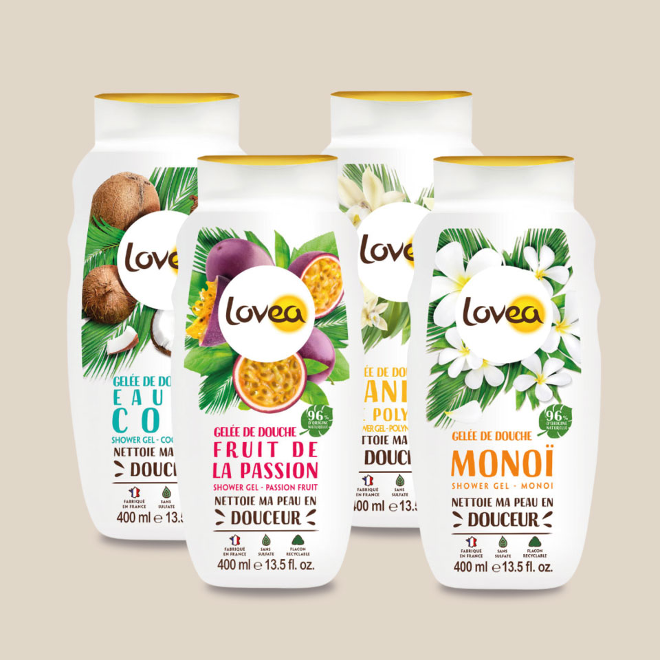 Shower gel with a combination of gentle foaming agents, free of sulfated surfactants, glycerin-based and pH neutral.
