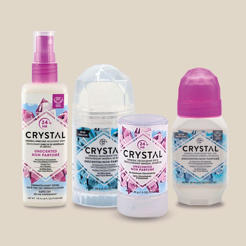 Le déodorant minéral The Crystal – Sans parfum est formulé à partir de pierre d’alun pure, reconnue pour ses propriétés antibactériennes et purifiantes.