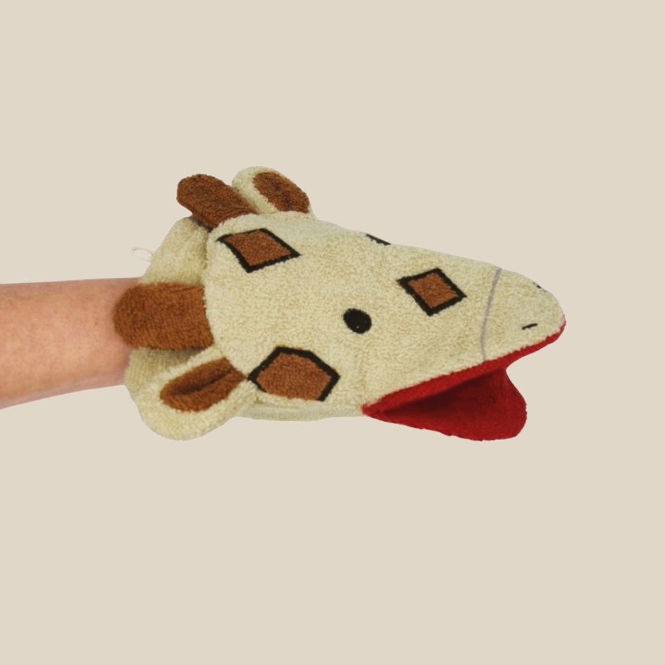 Avec son long cou gracieux et ses taches chaleureuses, cette girafe élégante et douce invite à la rêverie et à la complicité. Glissez vos mains dans le gant de toilette et donnez vie à ce compagnon tout en hauteur : le bain devient un moment tendre et ludique à partager avec votre enfant.